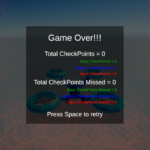 A little bug, that can be easily fixed, is with the score being updated twice if you clip the sides of the checkpoints. A solution would be to hide the trigger boxes on that checkpoint as soon as it touches a check point, e.g., if player misses, then hide all trigger boxes. And have them all slightly different depths until a more permanent solution is available.
