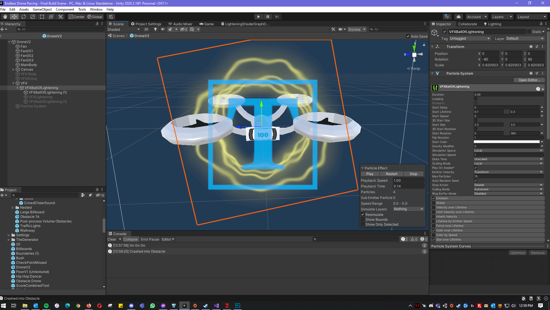 Working on more stats to be shown on gameover screen. Add code to play the sounds. Once drone UV is done, add vfx to body of drone for each time the drone goes through a checkpoint.